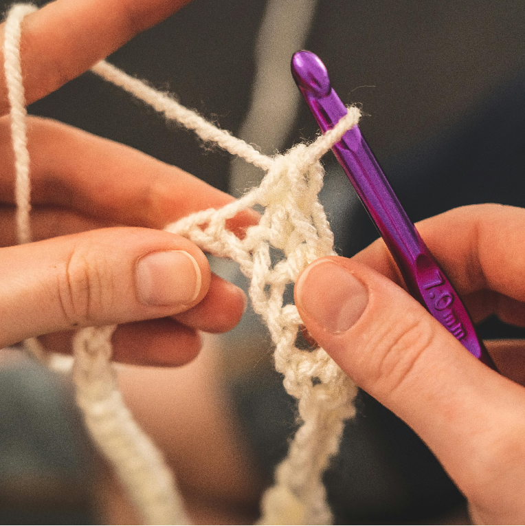Crochet uses a hook to interlock loops of yarn to create a textile. Learn how to make a coaster using medium weight yarn, a 5 mm crochet hook, and basic crochet stitches – chain, single crochet, half double crochet and double crochet.