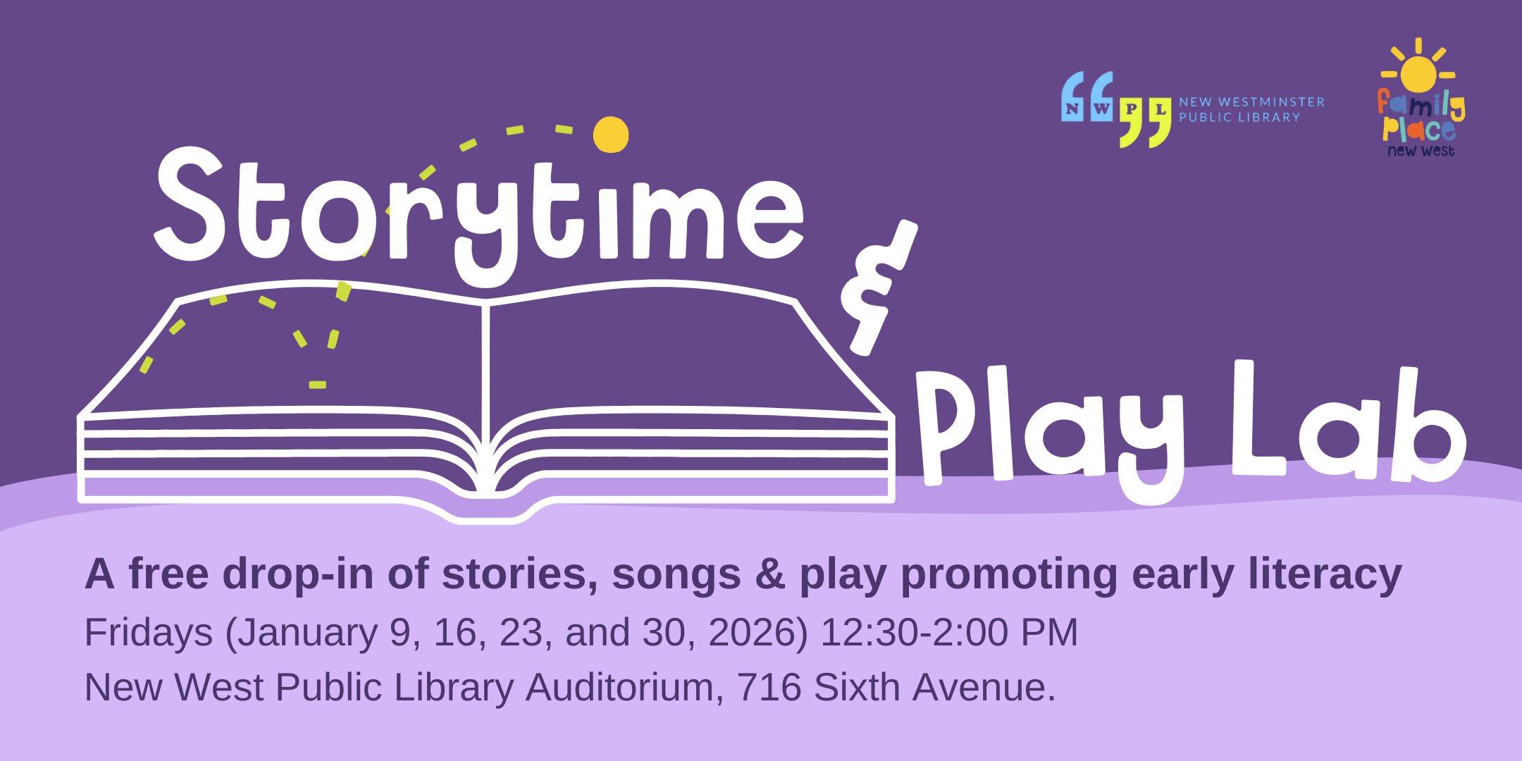 This is a FREE 90 minute early literacy drop-in hosted by New Westminster Family Place, here at the Library. No registration required.